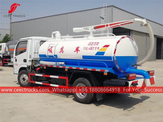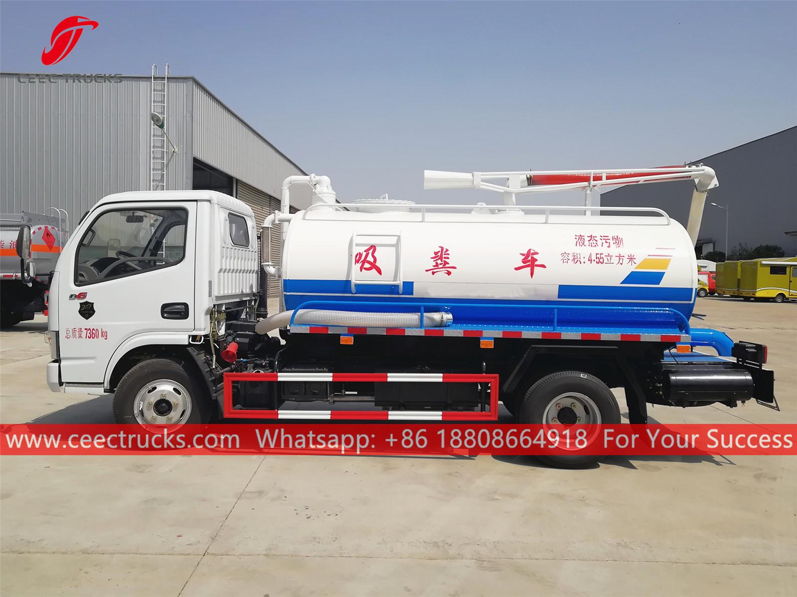 동풍 4.5cbm 진공 탱크 트럭, 좌측 핸들 구동 모델 4x2 섀시, 5단 수동 기어박스, CHAOCHAI 102HP 디젤 엔진, 페인팅 및 로고는 요구 사항에 따라 달라집니다.