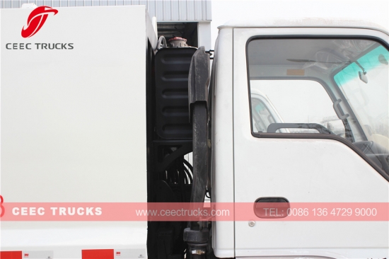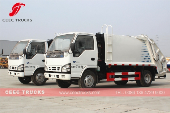 이스즈 5cbm 쓰레기 압축기 트럭, 일본 기술 이스즈 트럭 섀시 4*2 모델, 이스즈 4KH1-TC 120HP 디젤 엔진, MSB 5단 수동 기어박스, 5000L 쓰레기 압축기 탱크차에 사용, 고강도 소재 강철 사용, 두께 5mm 이상, 간편한 작동을 위한 전기 및 유압 제어 장치 포함. 페인팅 및 로고는 요청에 따라 달라집니다.