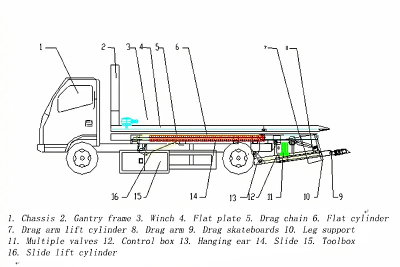 ● 고장난 차량을 견인해야 할 때, 유압 시스템은 텔레스코픽 암의 각도와 길이를 조정하고 트레일러 프레임의 위치를 정밀하게 제어하여 차량을 견인 트럭의 침대나 팔레트 위로 안정적으로 끌어올립니다.
