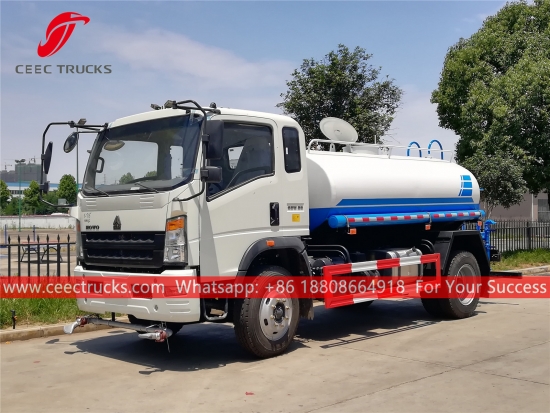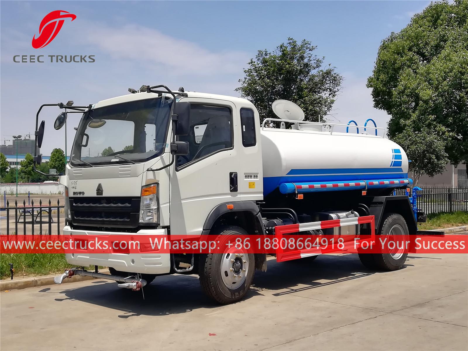 HOWO 8,000L 물 분사 트럭, HOWO 4x2 좌측 핸들 구동 섀시, 6단 수동 변속기, SINOTRUK 160마력 디젤 엔진, 유명 브랜드 물 펌프, 전면, 중앙, 후면 분사 노즐 옵션. 모든 도색 및 로고는 요구 사항에 따라 달라집니다.