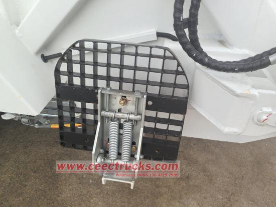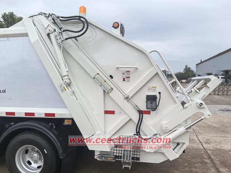 운전자와 장비의 안전을 보장하기 위해 차량에는 다양한 안전 보호 장치가 설계되었습니다. 비상 정지 버튼은 사고를 방지하기 위해 어떤 상태나 위치에서도 쓰레기 압축 장치를 즉시 정지시킬 수 있도록 설계되었습니다. 또한, 리프팅 실린더에는 방폭 밸브가 장착되어 있어 오일 파이프가 갑자기 파손될 경우 필러가 하강하는 것을 방지하여 위험을 방지합니다.