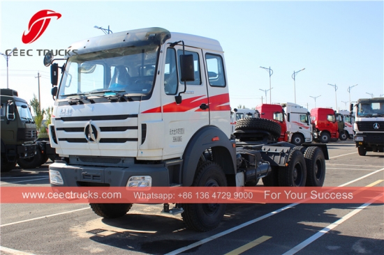 BENZ TECHNOLOGY가 탑재된 Congo Beiben 2534 트랙터 트럭, WD615.38 엔진을 탑재한 이 North Benz 2534 RHD 견인 트럭은 380마력, 자중 9,200kg, 정격 견인 중량 40,000kg입니다. 전체 치수는 7,280*2,500*3,450mm입니다.