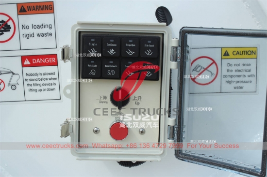 ** 후방 알람 및 카메라 장착 가능. ** 이탈리아 멀티밸브를 선택할 수 있습니다. ** 240L(단일 쓰레기통 또는 이중 쓰레기통) 또는 쓰레기통 리프터가 있는 표준 660L, 1100L 쓰레기통을 선택할 수 있습니다. |