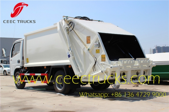 미얀마 5 CBM 압축기 쓰레기 수거차는 동풍 3,300mm 휠베이스 4x2 LHD 섀시, 차오차이 95마력 엔진, 그리고 5단 수동 변속기를 사용하여 조작이 간편합니다. 최고 품질의 탄소강 Q235 소재로 제작된 압축기 차체