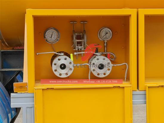 BPW 브릿지(13T)가 있는 3축, 12R22.5 12PR(13개), JOST 킹핀, JOST 레그(25T), 기계식 액체 레벨 미터, 이중 압력계, 이중 온도계, 이중 비상 절단 밸브, 4볼 밸브, 이중 안전 밸브, 도구 상자 2개, 단일 출구, 이중 적재 및 하역 시스템, 알루미늄 차양 보호대, ABC형 9kg 소화기 2세트, CO2형 2kg 소화기 1세트, 위험 표지판 3세트, 주황색 번호판 2세트, 프린터가 있는 유량계 |