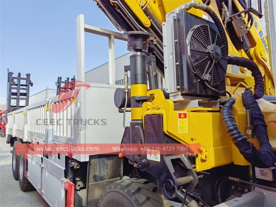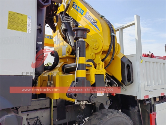 HOWO 25톤 너클 크레인 트럭, HOWO 8x4 LHD 섀시, SINOTRUK 12단 수동 변속기, 유명 중국 브랜드 SINOTRUK 400마력 디젤 엔진, 고강도 강철 평베드 차체, HYVA 또는 국산 유압 리프터 옵션 제공. 모든 도색 및 로고는 요구 사항에 따라 달라집니다.