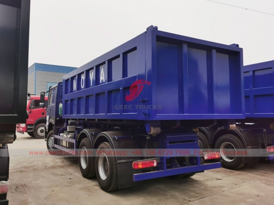 HOWO 20cbm 후크 리프트 쓰레기 수거차, HOWO 6x4 우현 모델 섀시, 웨이차이 336마력 디젤 엔진, 10단 수동 변속기, 고강도 후크 로더 시스템, 모든 종류의 쓰레기 용기 옵션 제공. 도색 및 로고는 요구 사항에 따라 달라질 수 있습니다.