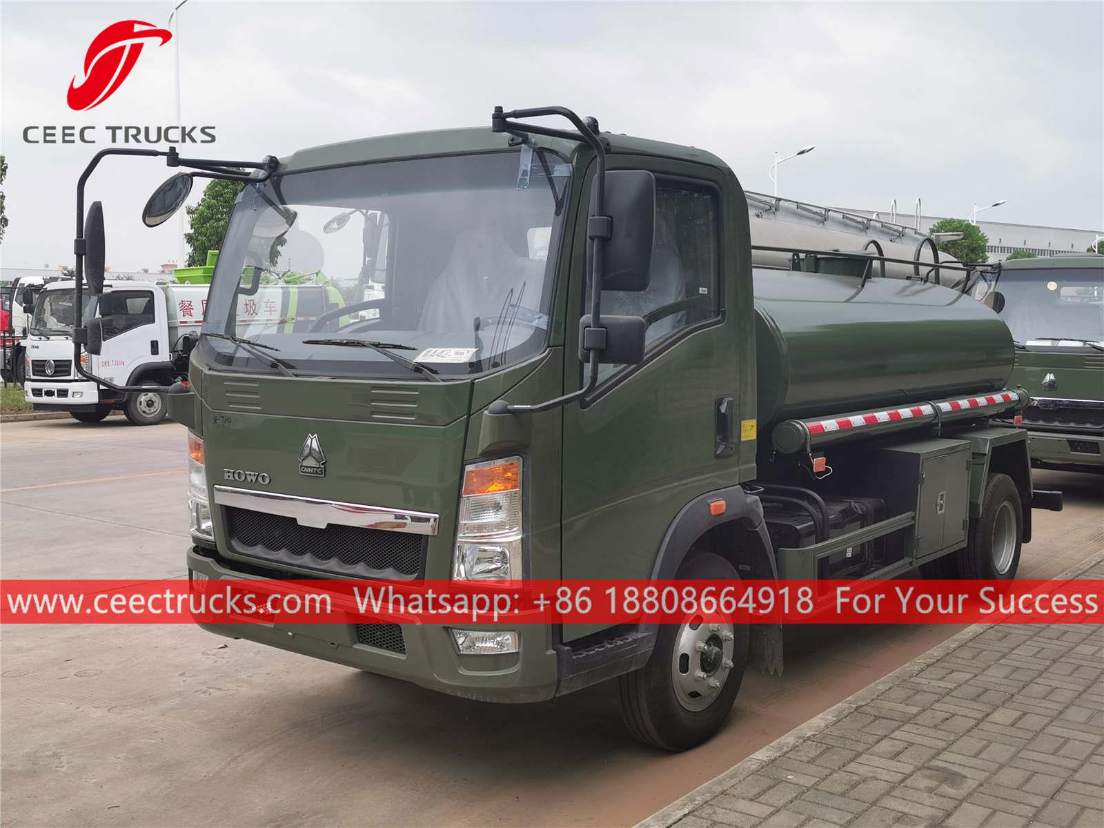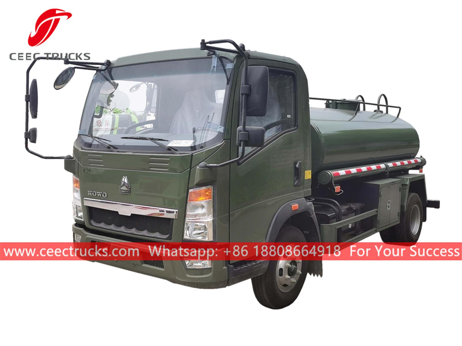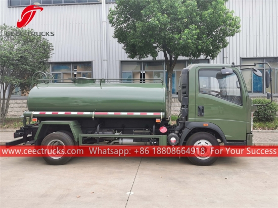 HOWO 3,000L 물 분사 트럭, HOWO 4x2 좌측 핸들 구동 섀시, 5단 수동 변속기, YUNNEI 95마력 디젤 엔진, 유명 브랜드 물 펌프, 전면, 중앙, 후면 분사 노즐 옵션. 모든 도색 및 로고는 요구 사항에 따라 달라집니다.
