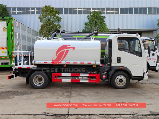 HOWO 4,000L 물 수송 트럭, 시노트룩 브랜드 4x2 물탱크 트럭, 5단 수동 기어박스, 유명한 110Hp 디젤 엔진, 유명 브랜드 물 펌프, 전면, 중앙 및 후면 분사 노즐 포함.