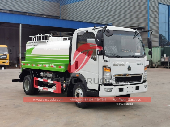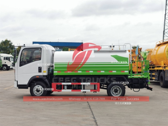 HOWO 5,000L 물 트럭, 시노트룩 HOWO 4x2 경량 섀시, 5단 수동 기어박스, 유명한 116Hp 디젤 엔진, 중국 유명 브랜드 물 펌프, 전면, 중앙 및 후면 분사 노즐 포함.