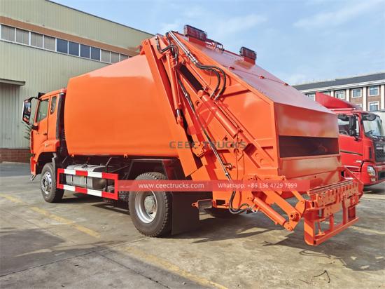 ♦ Howo 가비지 리어 로더는 Q235 특수강으로 만든 15CBM 곡선형 탱크 본체(두께 4mm)와 통합 성형 공정을 특징으로 합니다.