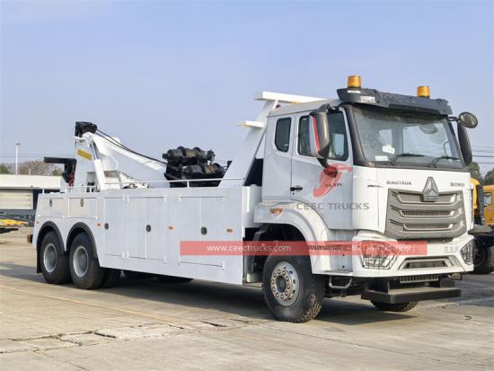 With two 10tons hydraulic winches이것 heavy duty wrecker , built by CEEC Trucks Group, utilizes the Howo NX cabin 6 x 4 drive chassis is equipped with a powerful WP10.340E22 diesel engine,3 4 0 HP /1250N . m of torque,HW1 9710 10 -speed transmission. Combined with an 9 ton front axle and 16 ton rear axle, it ensures exceptional power, load-bearing capacity, and reliability. It incorporates two 1 2 ton s hydraulic winches, resulting in an impressive rated towing capacity of 18 tons, making it ideal for handling accidents involving large trucks, buses, and construction machinery.