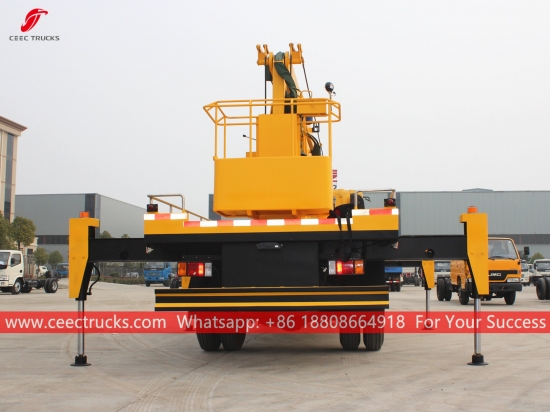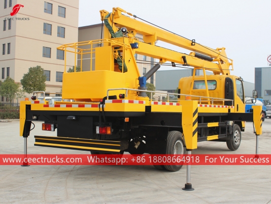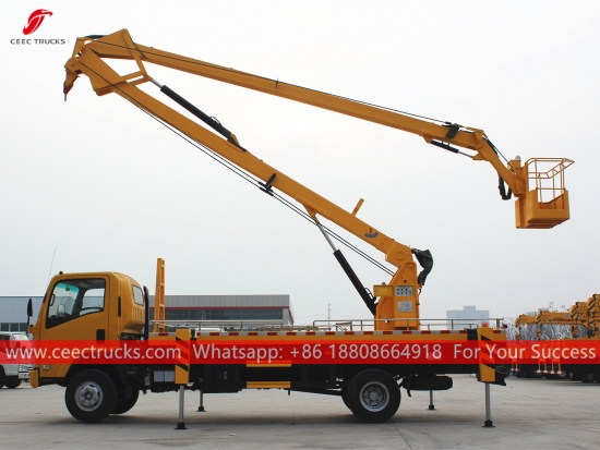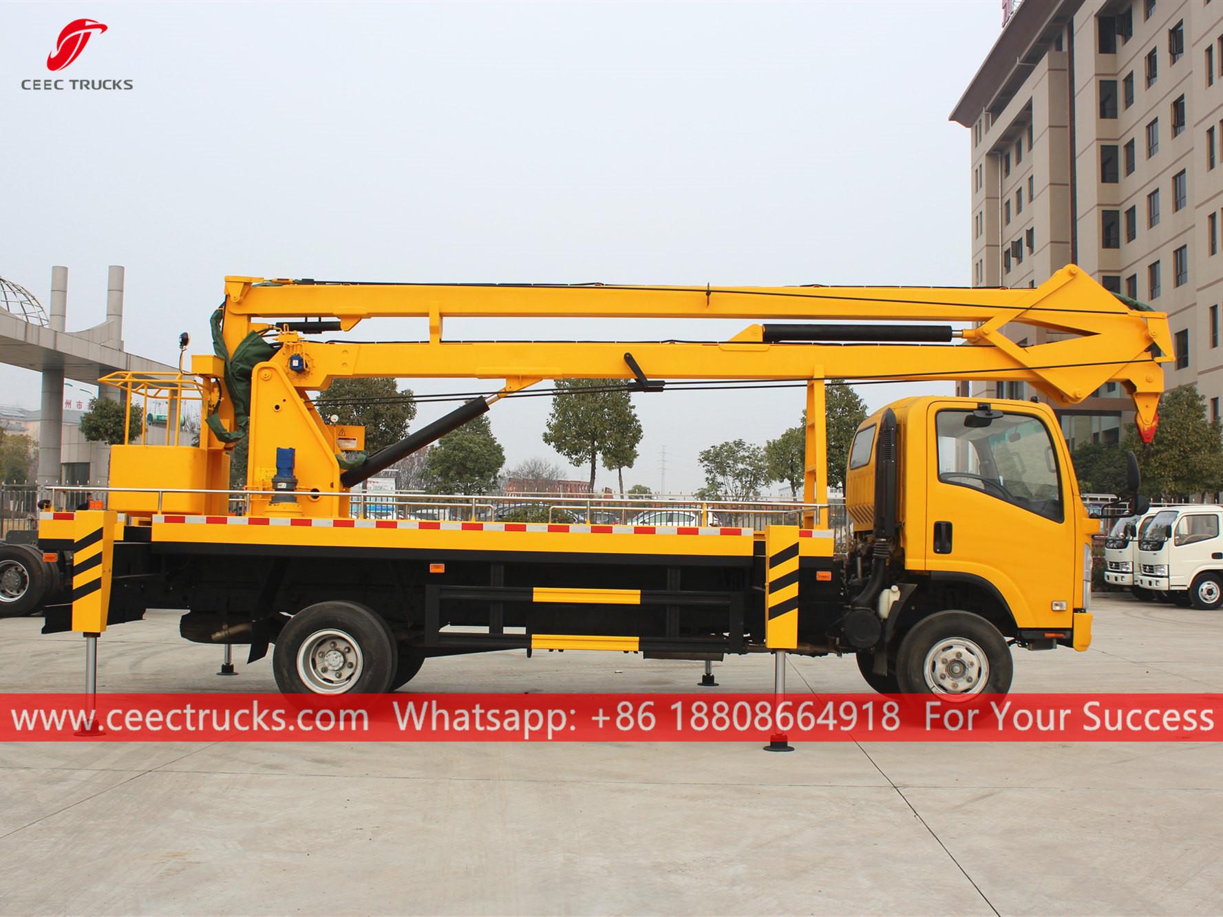 18m 버킷 크레인 리프팅 트럭, 이스즈 700P 4x2 섀시, MLD 6단 수동 변속기, 이스즈 190마력 디젤 엔진, 도색 및 로고는 요구 사항에 따라 달라집니다. 고객 언어 제어 박스.