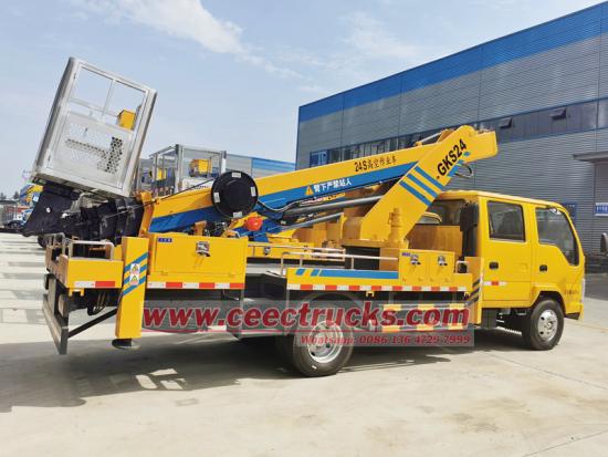 CEEC TRUCKS Hydraulic Aerial Platform Truck mounted based on type II ISUZU double row 4x2 truck chassis, mounted with 4 doors and 2 row totally 2+4 seats, telescopic arms could reach 24 meters height of air operations, widely used in street maintenance, landscaping works, television video, communications engineering, airport, decoration, aerial advertising and other areas of need.