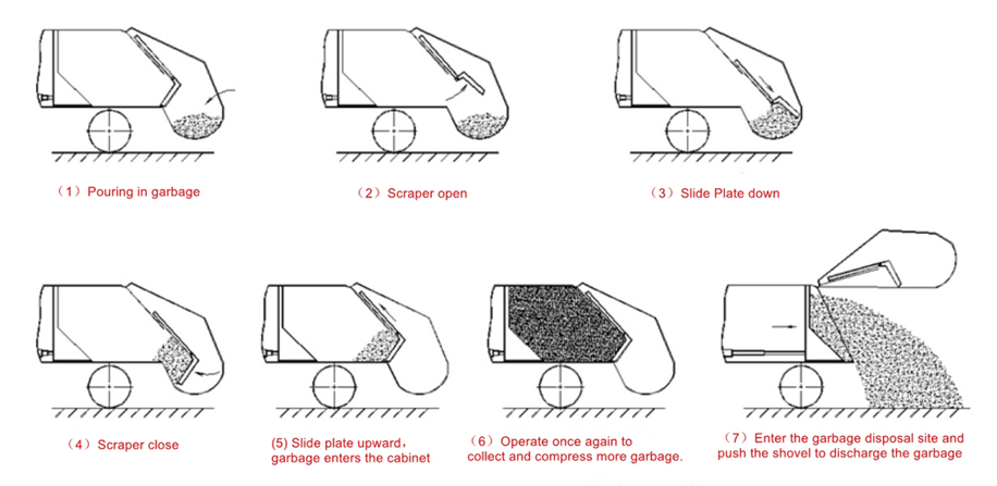 차량 엔진에서 생성된 동력은 동력인출장치(PTO)와 변속기 축을 통해 오일 펌프로 전달되고, 오일 펌프는 회전하여 고압 오일을 생성합니다. 다방향 역전 밸브의 제어 스위치를 작동하면 유압 오일이 관련 실린더를 구동하여 작동합니다. 이 실린더들은 푸시셔블, 스크레이퍼, 스케이트보드 등의 작동 장치를 구동하여 쓰레기 적재 및 압축 작업을 수행합니다. 적재 시에는 쓰레기를 쓰레기통에 채운 후, 푸시셔블의 추진력과 스크레이퍼 및 스케이트보드의 협동 작용을 통해 쓰레기를 점차 고밀도 상태로 압축합니다. 쓰레기통이 가득 차면 차량은 지정된 장소로 쓰레기를 운반하여 하역합니다.