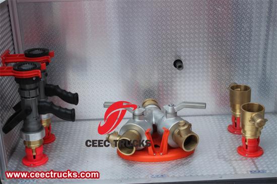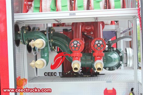 물 수집기: 집수기는 소방차가 외부 수원에서 물을 빠르게 흡수하는 데 중요한 장치입니다. 일반적으로 차량 전면이나 측면에 설치되며, 강력한 흡입력을 이용하여 호수, 강, 소화전 등의 수원에서 물을 빨아들여 물탱크로 보내 소방 활동에 필요한 충분한 물을 공급합니다.