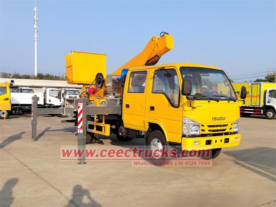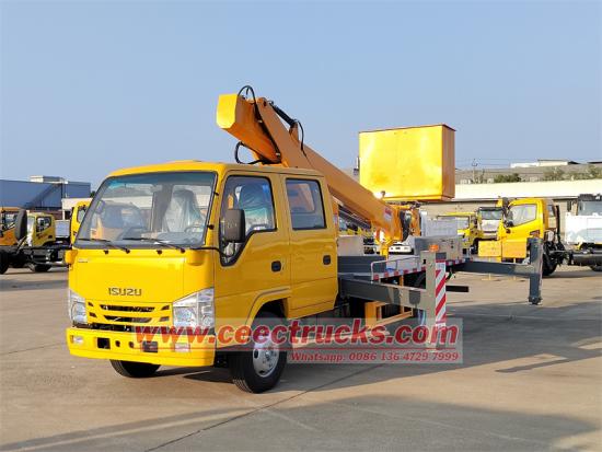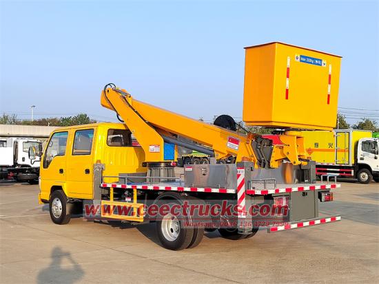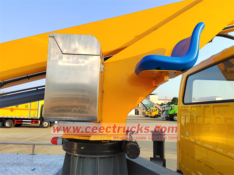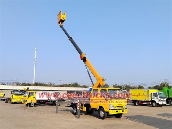 CAN BUS Remote control box for easy operation새롭게 맞춤화됨미니 ELF 시리즈 더블 로우 캡 디자인에 장착된 이스즈 16m 직선 고소작업차는 더 많은 운전자나 도구를 수용하고 팀 협업 효율성을 개선할 수 있습니다. 이스즈 16m 고소작업차원래 일본산 ISUZU 더블 캐빈을 기반으로 제작되었으며, 2+4 좌석과 편안한 운전감을 제공합니다. 103KW/140HP의 효율적인 디젤 엔진 4KH1N6MD 모델이 장착되어 있으며, 배기량은 EURO 6 기준 2999cc입니다. 또한 DPF 및 ADBlue 장치를 제거하도록 맞춤 제작하여 트럭을 EURO 3 및 4로 작동시켜 아시아와 아프리카의 요구 사항을 충족할 수 있습니다. 연료 소모량이 적고 신뢰성이 높으며 복잡한 도로 상황에 적응할 수 있습니다.편리하고 안전한 주행을 위해 전진 6단, 후진 1단의 MSB 6단 수동 변속기가 장착되어 있습니다. 강력한 적재 용량과 높은 차대 안정성으로 중장비 작업 장비 설치에 적합합니다.작업 높이이스즈 스트레이트 암 작업 플랫폼 트럭최대 약 16m까지 가능하며 가로등 유지관리, 건물 외벽 공사 등 대부분의 중·고층 공사에 필요한 작업을 포괄합니다.접이식 암 타입보다 유연성은 약간 떨어지지만 작업 반경이 더 깁니다.