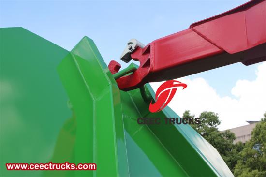 4단계. 쓰레기통을 차량 프레임 위에 놓은 후, 암 작동 핸들을 놓아 중간 위치로 되돌린 다음, 잠금 후크 작동 핸들을 잠금 위치까지 위로 당겨 잠금 실린더를 확장하고, 잠금 프레임을 위로 올려 플립 프레임과 쓰레기통을 잠근 후, 핸들을 놓아 중간 위치로 되돌립니다. 쓰레기통 적재가 완료되면, 동력 인출 장치를 해제하고 차량 전체를 운반할 수 있습니다.