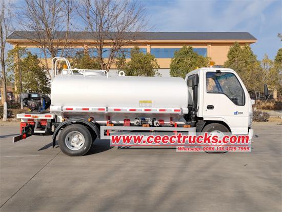 중동유럽 '의 Isuzu ELF 100P 물뿌리개 트럭은 물뿌리기 작업에 사용됩니다. 4KH1 120HP 엔진, 2999ml 배기량, Isuzu MSB 5단 기어박스가 장착된 Isuzu NKR 100P 경량 섀시에서 수정되었습니다. 트럭에는 5000L 타원형 탄소 물탱크가 있습니다.65QZF-40/50 워터 펌프, 후면은 연료 초고압 세척기, 전면은 스프레이입니다. 이를 통해 차량이 효율적으로 물뿌리기 작업을 수행할 수 있습니다.