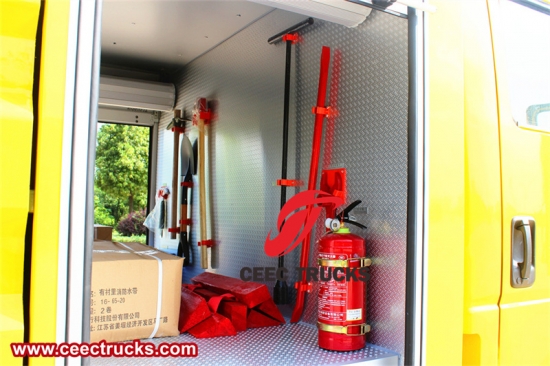 캐빈 상단에 회전등을 장착하여 경보를 울리고, 소방 장비와 차량 도구를 갖추어야 합니다. |