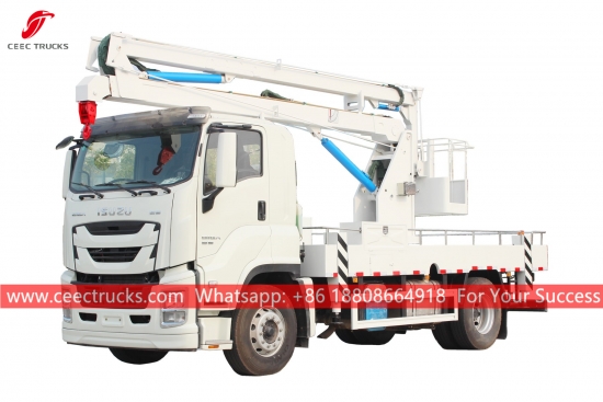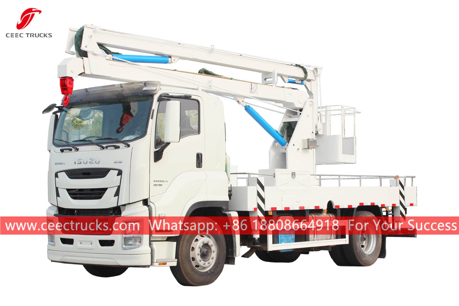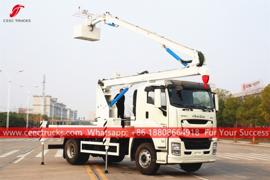 이스즈 16m 버킷 크레인 리프팅 트럭, 이스즈 GIGA 좌측 핸들 4x2 섀시, FAST 12단 수동 변속기, 이스즈 380마력 대형 디젤 엔진, 도색 및 로고는 고객 요구 사항에 따라 달라질 수 있습니다. 고객 언어 제어 박스.