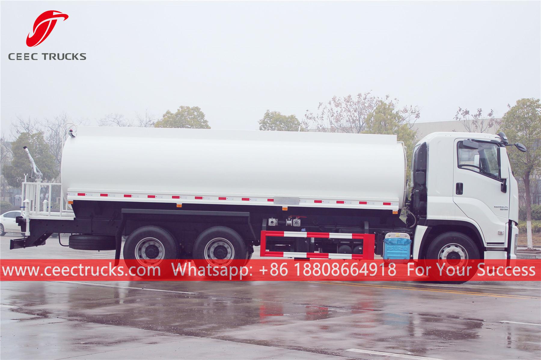 이스즈 20,000L 워터보우저 트럭, 이스즈 기가 좌측 핸들 섀시, ZF 16단 수동 변속기, 이스즈 380마력 디젤 엔진, 유명 브랜드 워터펌프, 전면, 중앙, 후면 분사 노즐 옵션. 모든 도색 및 로고는 요구 사항에 따라 달라집니다.