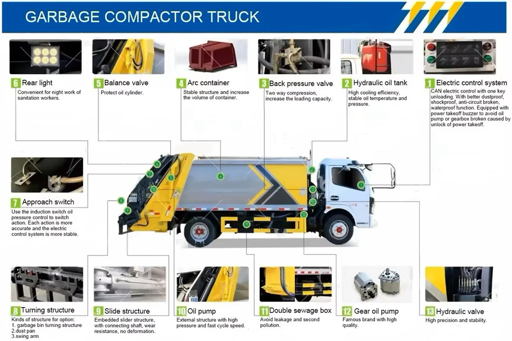 이스즈 기가 4X 리어 로더 트럭침대가 있는 GIGA 4X 캐빈을 기반으로 제작되었으며, 압축기 본체 용량은 최대 8톤/10CBM입니다. CAN BUS 전기 제어 시스템과 유압 조이스틱 제어 시스템을 갖추고 있으며, 주로 쓰레기 수거 및 운송에 사용되며 작업 대상은 도심 거리, 공장, 커뮤니티 및 기타 필요한 지역입니다.이스즈 리어 로더 트럭장착형 쓰레기 압축기 본체 재질은 국제 표준 고강도 탄소강 T420이며, HARDOX 재질로 맞춤 제작이 가능합니다. 내외부 모두 방청 도장 처리되어 녹 발생을 효과적으로 방지합니다.이스즈 기가 4X 10cbm 쓰레기 압축기 트럭새롭게 설계된 CAN-BUS 스마트 제어 시스템, 다기능 쓰레기 압축 시스템, 측면 승강 사다리, 캐빈 및 호퍼 후면의 전기 제어 박스, 그리고 후면에 설치된 풋 페달을 통해 다양한 구역의 쓰레기를 수거할 수 있도록 맞춤 설계되었으며, 두 개의 폐수 수거 탱크는 운송 중 2차 오염을 효율적으로 방지합니다. 1열 시트를 갖춘 운전석은 편안한 승차감을 선사합니다. 따라서 이 트럭은 주로 기름 운반 및 급유 기능을 위한 이상적인 쓰레기 수거 트럭입니다.이스즈 쓰레기 압축기 트럭다른 폐기물 수거 차량과 차별화되는 고유한 기능을 갖추고 있습니다. 완전 유압식 리프팅 시스템을 탑재하여 운전자가 국제 표준 폐기물 용기를 신체 접촉 없이 들어 올려 트럭에 버릴 수 있습니다. 쓰레기통 용량은 120L, 240L, 360L, 660L, 770L, 1100L로 맞춤 제작할 수 있습니다. 이러한 기능은 운전자의 안전을 보장할 뿐만 아니라 효율성을 높이고 쓰레기 투기 위험을 줄여줍니다.