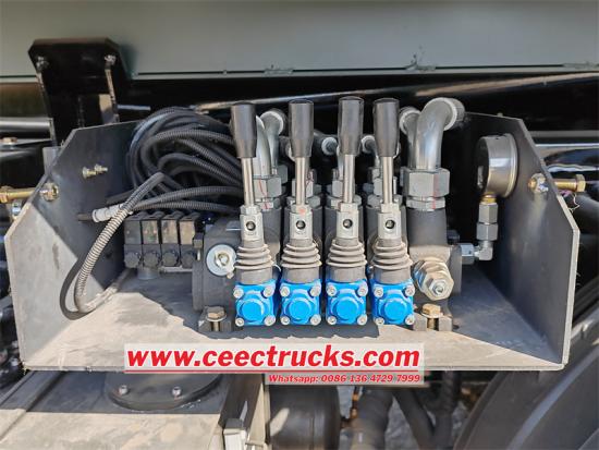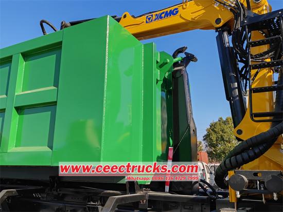이스즈 중장비 후크 리프트 트럭(컨테이너 포함)은 접이식 암 크레인이 장착된 이스즈 후크 암 덤프 트럭으로, 중량물 운반 및 인양에 사용됩니다. 크레인 꼬리 부분은 강철 그래버로 제작되었습니다. 크레인은 XCMG LQS120 로더 크레인으로, 최대 인양 중량 18톤, 최대 인양 모멘트 12t·m입니다. 이 차량은 이스즈 VC61 6X4 섀시를 기반으로 개조되었으며, 6UZ1-TCG61 380마력 엔진과 FAST 12단 변속기가 장착되어 있습니다. 덤프 트럭 크기는 8,200*2,300*1,200mm이며, 측면 6개, 바닥 8개입니다.