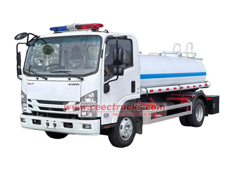 이스즈 KV100 견인식 스프링클러 워터보우저는 신형 이스즈 KV100 섀시를 기반으로 개조되었으며, 4KH1CN6LB 120마력 엔진, 직렬 4기통 4행정 엔진, 이스즈 MSB 5단 변속기가 장착되어 있습니다. 상단에는 5cbm 스테인리스 스틸 물탱크가 있습니다. 스테인리스 스틸 필터와 스테인리스 스틸 40/50 워터펌프가 장착되어 있습니다. 운전석 상단에는 빨간색과 파란색 경고등이 있습니다.