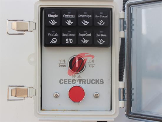 이 시스템은 PLC 제어 박스에서 제어되며, 시작, 정지, 1사이클, 연속 사이클 및 구조 활동을 활성화합니다. 테일게이트 및 이젝터 제어 장치는 차체 전면에 있습니다. 모든 적재 제어 장치는 테일게이트 오른쪽에 장착되어 있으며, 안전을 위해 모두 수동 제어됩니다. 압축은 푸시 버튼을 통해 전기적으로 제어되며, 필요한 경우 수동으로도 제어됩니다. |