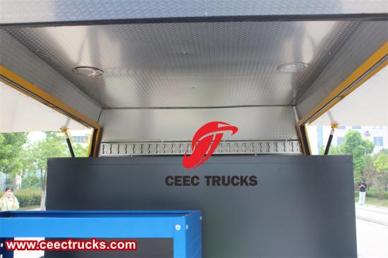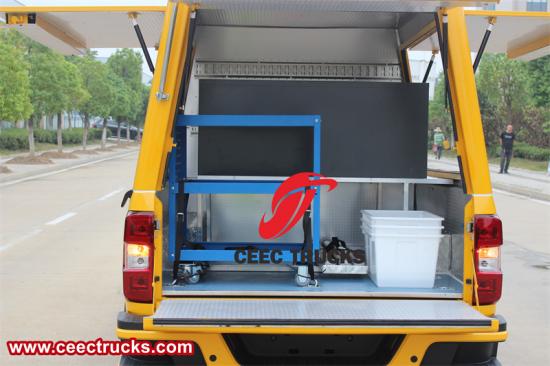 이스즈 4x4 픽업 모빌 워크숍 트럭은 견고한 차체 라인과 넓은 휠 아치 디자인을 채택하여 강력한 오프로드 스타일을 자랑합니다. 차체는 고강도 강철로 제작되어 뛰어난 비틀림 방지 및 충돌 방지 성능을 제공하여 혹독한 환경에서도 안전한 주행을 보장합니다. 독특한 적재함 디자인은 다양한 서비스 요구에 따라 다양한 공구와 장비를 유연하게 구성하여 간단한 유지보수 작업부터 복잡한 기술 지원까지 완벽하게 지원합니다.