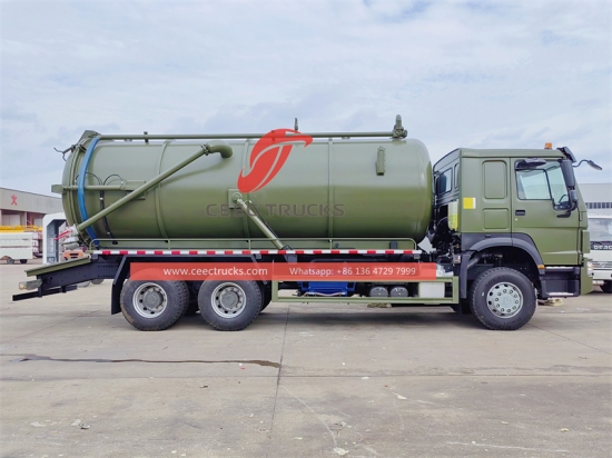 HOWO 6×4 진공 탱크 트럭 (진공 하수 처리 트럭, 하수 흡입기, HOWO 하수 처리 트럭, 배수구 비우기, 정화조 트럭, 정화조 비우기라고도 함) 오수, 슬러지, 정화조, 원유 등의 액체와 작은 돌, 벽돌 등의 고형물을 수거, 운반, 배출하는 데 사용됩니다. 하수구, 정화조, 오수통, 도랑 등의 청소에 적합하며, 환경 및 위생 분야에서 널리 사용됩니다.